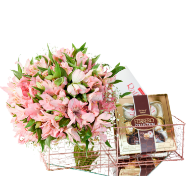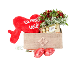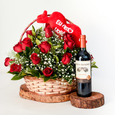 Nossa cesta especial vem com um coração apaixonado e deliciosos chocolates, perfeita para surpreender quem faz seu coração bater mais forte.